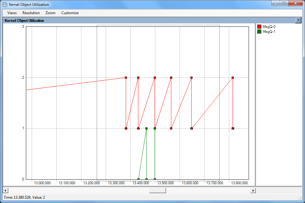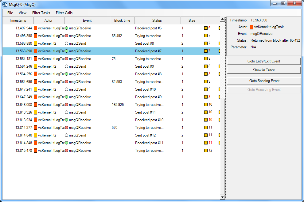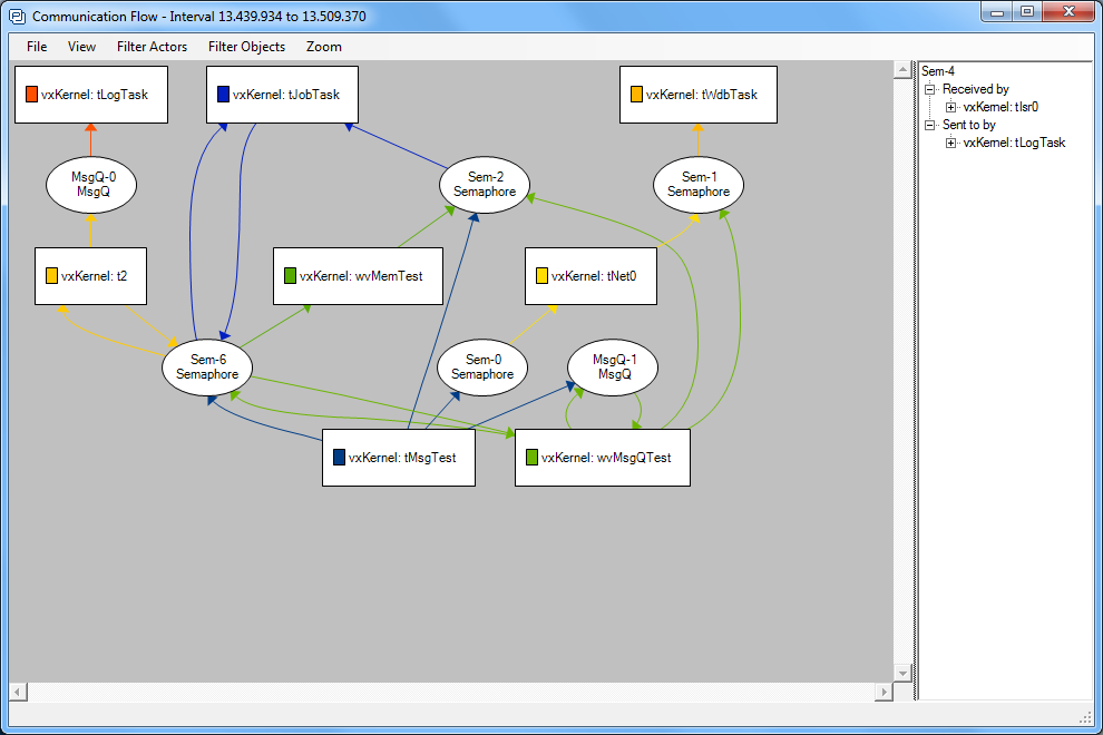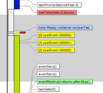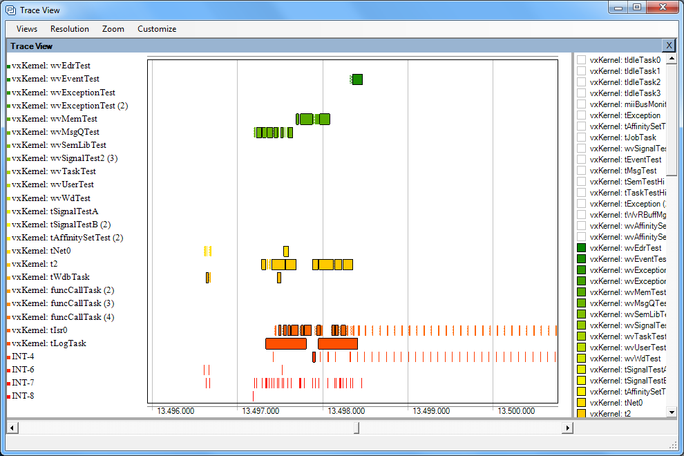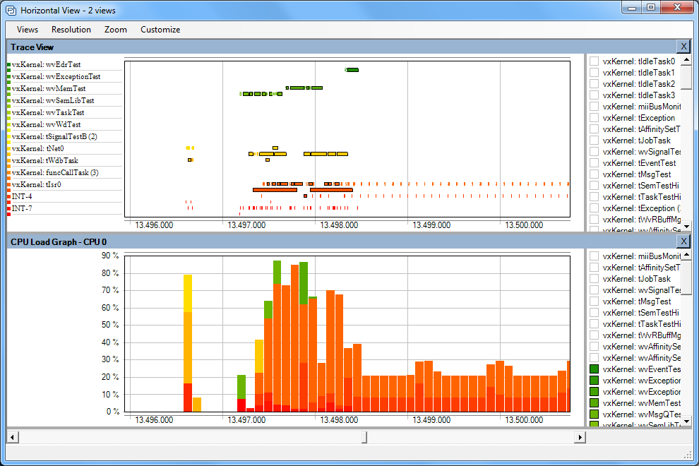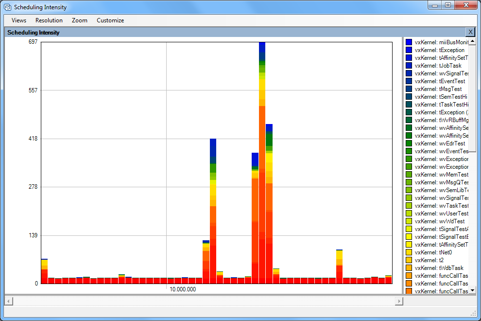 Die Visualisierung zeigt das VxWorks-Kernel Verhalten z.B. des Scheduling, System-Calls, Messages, Semaphoren und Interrupts auf. Es wurde um eine anwendungsorientierte Aufzeichnung von Ereignissen ergänzt, die auch dazu verwendet werden können, Daten als zeitliche Kurve darzustellen. Damit wird die Entwicklung regelungstechnischer Anwendungen viel einfacher.